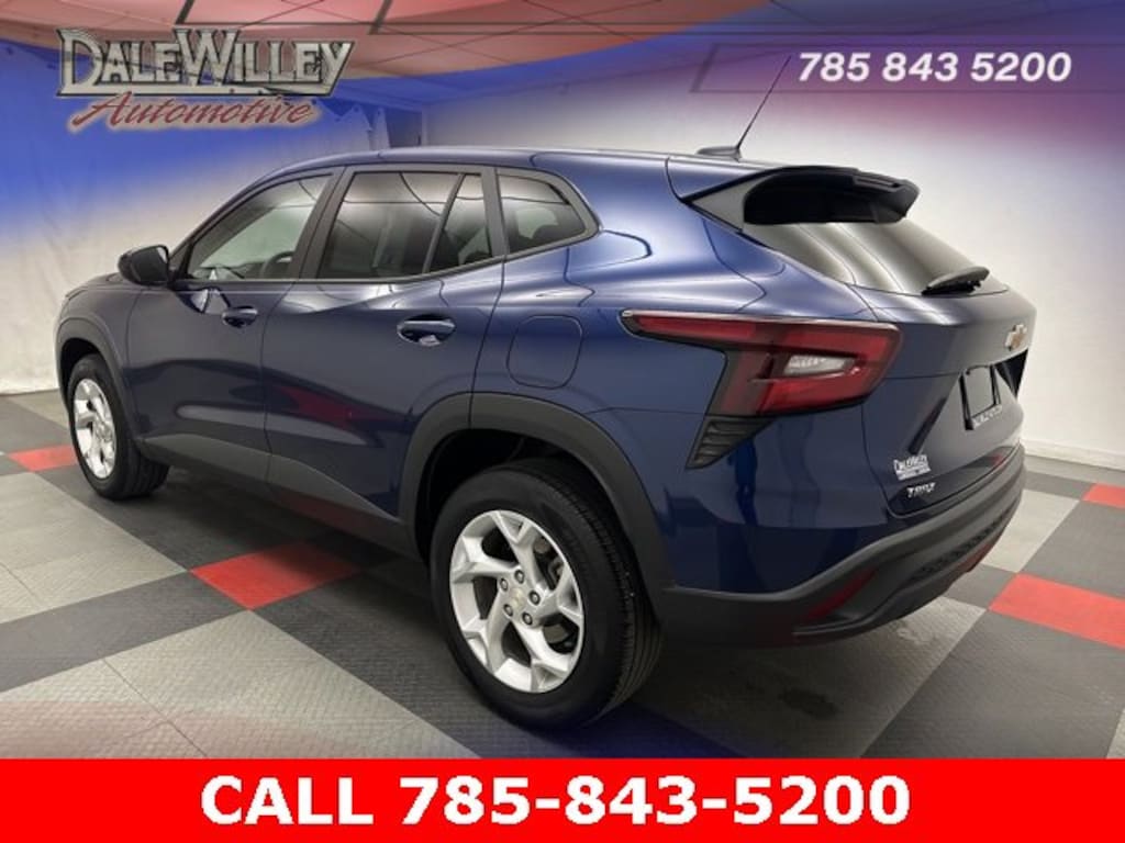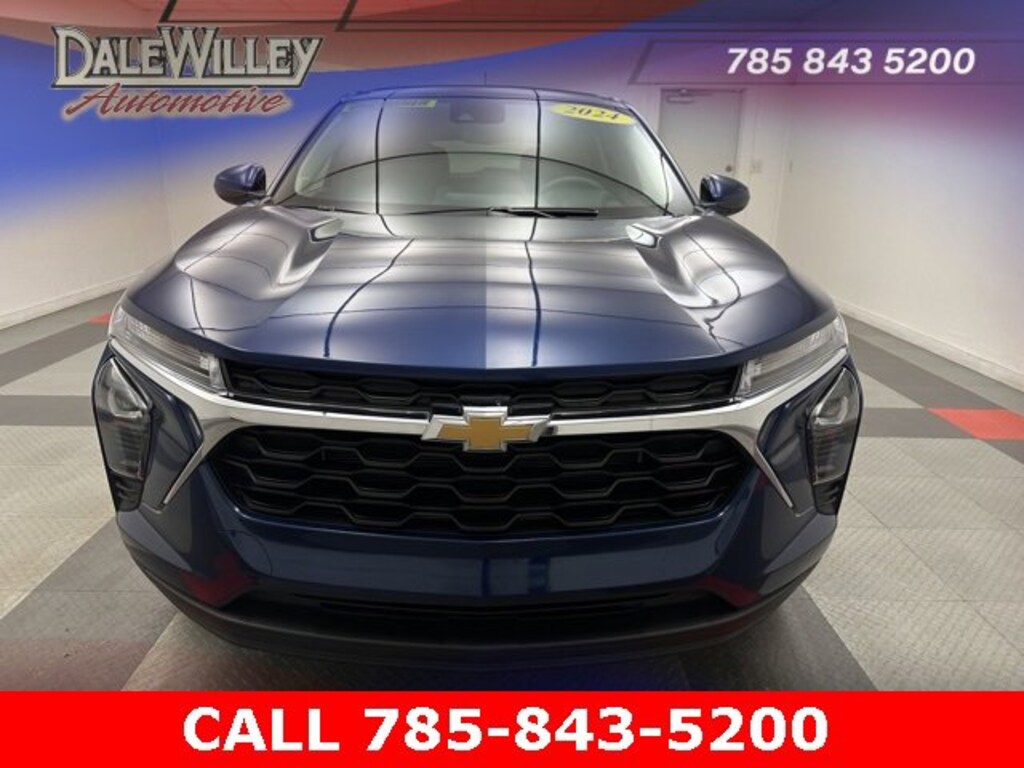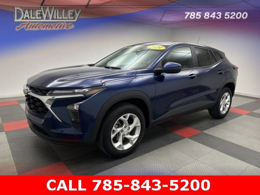 Located at Dale Willey Automotive Used Car and Truck Center / 2800 Iowa St, Lawrence, KS 66046. 2024 Chevrolet Trax Blue Glow Metallic LS FWD 6-Speed Automatic 1.2L Ecotec Turbo DOHC DI w/VVT HEATED SEATS, ONE OWNER, Trax LS, 4D Sport Utility, 1.2L Ecotec Turbo DOHC DI w/VVT, 6-Speed Automatic, FWD, Blue Glow Metallic, Jet Black/Gray With Blue Accents Cloth, 4-Speaker Audio System Feature, Body-Color Painted Mirror Caps, Carpeted Rear Floor Mats, Driver Confidence Package, Dual front impact airbags, Dual front side impact airbags, Electronic Stability Control, Front & Rear All-Weather Floor Mats, Front & Rear Premium Carpeted Floor Mats (LPO), Fully automatic headlights, Heated Driver & Front Passenger Seats, Heated Power-Adjustable Outside Mirrors, Lane Change Alert w/Side Blind Zone Alert, LS Convenience Package, Occupant sensing airbag, Overhead airbag, Preferred Equipment Group 1LS, Radio: Chevrolet Infotainment 3 System w/AM/FM, Rear Cross-Traffic Alert, Rear Park Assist, Remote Start, SiriusXM, Steering wheel mounted audio controls, Wheels: 17 Silver Painted Aluminum, Winter/Summer Mat Package (LPO).