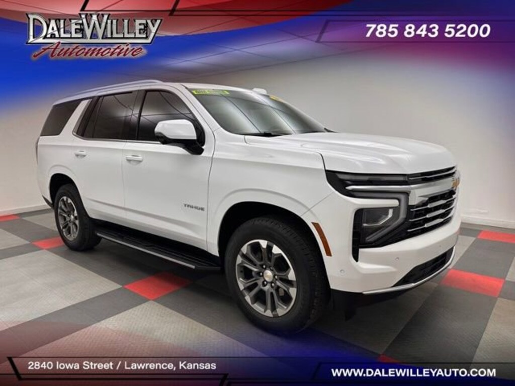 Located at Dale Willey Automotive Used Car and Truck Center / 2800 Iowa St, Lawrence, KS 66046. 2025 Chevrolet Tahoe Summit White LT 4WD 10-Speed Automatic with Overdrive EcoTec3 5.3L V8 CLEAN VEHICLE HISTORY...NO ACCIDENTS, RECENT TRADE IN, LEATHER, HEATED SEATS, FOUR WHEEL DRIVE 4WD, ONE OWNER, Tahoe LT, 4D Sport Utility, EcoTec3 5.3L V8, 10-Speed Automatic with Overdrive, 4WD, Summit White, Black Leather, 1st and 2nd Row Color-Keyed Carpeted Floor Mats, 1st and 2nd Rows All-Weather Floor Liners, 2nd Row Power Release 60/40 Split-Folding Bench Seat, 3-Spoke Wrapped Steering Wheel, 3rd Row 60/40 Power-Folding Split-Bench Seat, 3rd Row All-Weather Floor Liners, 3rd Row Manual 60/40 Split-Folding Bench Seats, 6-Speaker Audio System Feature, All-Weather Cargo Mat, All-Weather Liner Protection Package, Apple CarPlay/Android Auto, Auto-Dimming Inside Rear-View Mirror, Automatic temperature control, Bose 10-Speaker Centerpoint Surround Audio System Feature, Color-Keyed Carpeting Floor Covering, Comfort Package, Electronic Stability Control, Exterior Parking Camera Rear, Floor Console with Storage Area, Front Bucket Seats, Front LED Fog Lamps, Front Pedestrian and Bicyclist Braking, Frontal Driver and Outboard Passenger Airbags, Heated 2nd Row Outboard Seats, Heated front seats, Heated Steering Wheel, Leather-Appointed Seat Trim, LED Headlamps with LED Daytime Running Lamps, LED Tail Lamps, License Plate Front Mounting Package, Luxury Package, Memory seat, Memory Settings, Memory Settings For Driver, Navigation system: Google built-in compatibility (select service plan required, terms and limitations apply), Outside Heated Power-Adjustable Mirrors, Preferred Equipment Group 1LT, Radio: 17.7 Diagonal Advanced Color LCD Display, Rear air conditioning, Rear Power Liftgate, Remote Start, SiriusXM with 360L Trial Subscription, Universal Home Remote, USB Ports, Wireless Phone Charging.