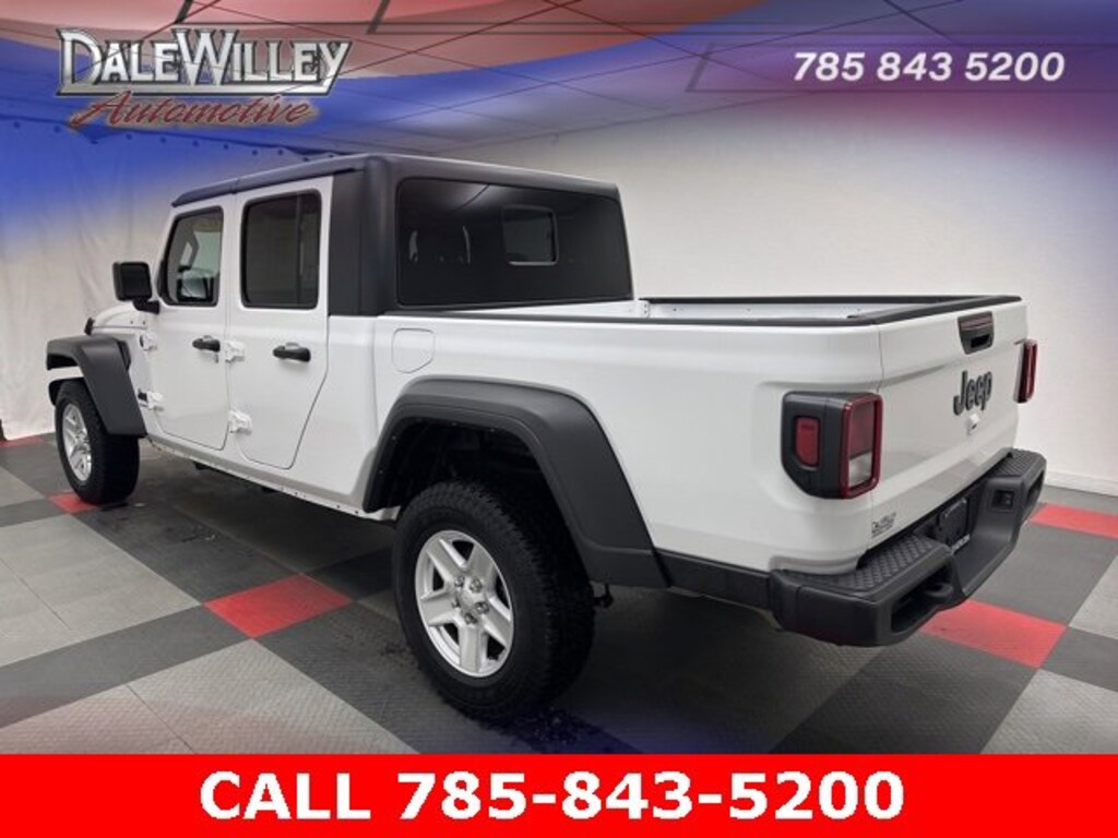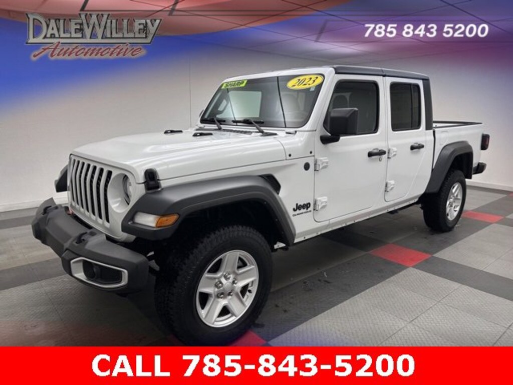 Located at Dale Willey Automotive Used Car and Truck Center / 2800 Iowa St, Lawrence, KS 66046. 2023 Jeep Gladiator Bright White Clearcoat Sport S 4WD 8-Speed Automatic 3.6L V6 24V VVT FOUR WHEEL DRIVE 4WD, Gladiator Sport S, 4D Crew Cab, 3.6L V6 24V VVT, 8-Speed Automatic, 4WD, Bright White Clearcoat, Black Cloth, 4G LTE Wi-Fi Hot Spot, ABS brakes, Apple CarPlay, Apple CarPlay/Android Auto, Automatic Headlamps, Compass, Deep Tint Sunscreen Windows, Dual front impact airbags, Dual front side impact airbags, Electronic Stability Control, Emergency communication system, Front 1-Touch Down Power Windows, Google Android Auto, Integrated Center Stack Radio, Integrated Voice Command w/Bluetooth, Low tire pressure warning, Normal Duty Plus Suspension, ParkView Rear Back-Up Camera, Power Heated Mirrors, Power Tailgate Lock, Premium Wrapped Steering Wheel, Quick Order Package 24S Sport S, Radio: Uconnect 4 w/7 Display, Remote Keyless Entry, Security Alarm, Speed Sensitive Power Locks, Sport S, Sun Visors w/Illuminated Vanity Mirrors, Traction Control, Wheels: 17 x 7.5 Tech Silver Aluminum.