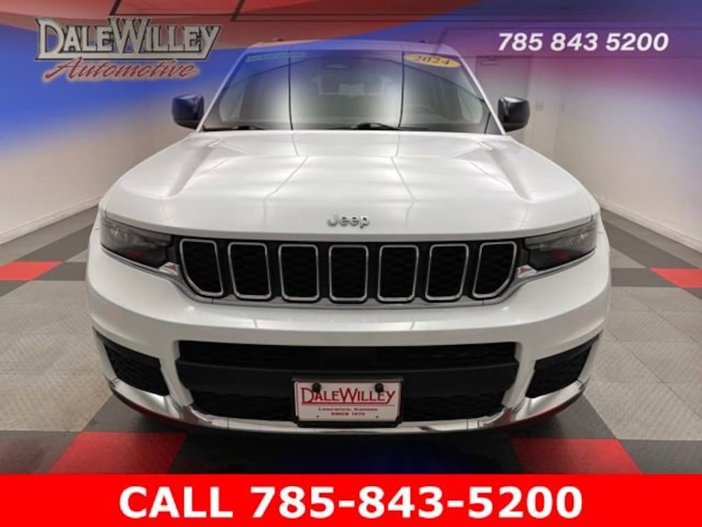 Located at Dale Willey Automotive Used Car and Truck Center / 2800 Iowa St, Lawrence, KS 66046. 2024 Jeep Grand Cherokee L Bright White Clearcoat Laredo 4WD 8-Speed Automatic 3.6L V6 24V VVT FOUR WHEEL DRIVE 4WD, Grand Cherokee L Laredo, 4D Sport Utility, 3.6L V6 24V VVT, 8-Speed Automatic, 4WD, Bright White Clearcoat, Black Cloth, Alloy wheels, Anti-whiplash front head restraints, Automatic temperature control, Dual front impact airbags, Dual front side impact airbags, Electronic Stability Control, Fully automatic headlights, Heated door mirrors, Knee airbag, Occupant sensing airbag, Overhead airbag, ParkView Rear Back-Up Camera, Power driver seat, Quick Order Package 23A Laredo, Radio: Uconnect 5 w/8.4 Display, Rear air conditioning, Remote Keyless Entry, Speed-Sensitive Wipers, Steering wheel mounted audio controls.
