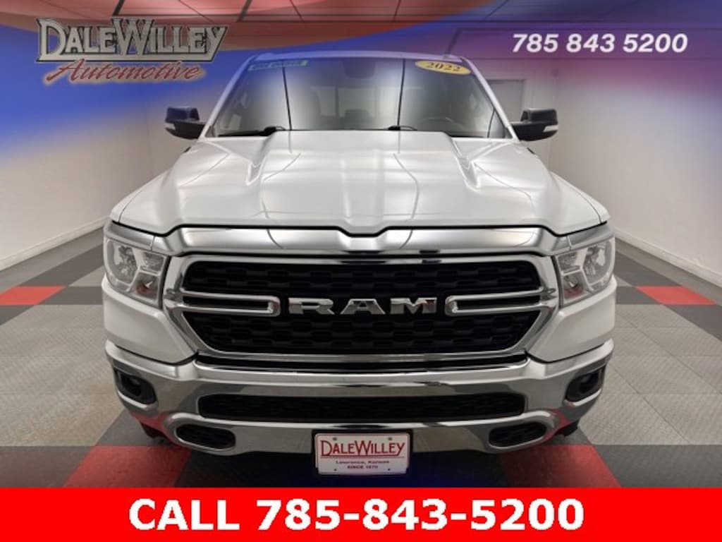 Located at Dale Willey Automotive Used Car and Truck Center / 2800 Iowa St, Lawrence, KS 66046. 2022 Ram 1500 Bright White Clearcoat Big Horn/Lone Star 4WD 8-Speed Automatic HEMI 5.7L V8 Multi Displacement VVT CLEAN VEHICLE HISTORY...NO ACCIDENTS, RECENT TRADE IN, FOUR WHEEL DRIVE 4WD, ONE OWNER, 1500 Big Horn/Lone Star, 4D Crew Cab, HEMI 5.7L V8 Multi Displacement VVT, 8-Speed Automatic, 4WD, Bright White Clearcoat, Black Cloth, 2nd Row In Floor Storage Bins, 4G LTE Wi-Fi Hot Spot, 8.4 Touchscreen Display, Alloy wheels, Apple CarPlay, Auto-Dimming Exterior Driver Mirror, Auto-Dimming Rear-View Mirror, Big Horn Badge, Big Horn Level 1 Equipment Group, Black Exterior Mirrors, Black Premium Power Mirrors, Bluetooth Handsfree Phone & Audio, Class IV Receiver Hitch, Cluster 3.5 TFT Color Display, Connectivity - US/Canada, Convex Wide-Angle Mirror Insert, Dual front impact airbags, Dual front side impact airbags, Electronic Stability Control, Exterior Mirrors Courtesy Lamps, Exterior Mirrors w/Heating Element, Exterior Mirrors w/Supplemental Signals, For Details, Visit DriveUconnect.com, Fully automatic headlights, Global Telematics Box Module (TBM), Glove Box Lamp, Google Android Auto, GPS Antenna Input, Integrated Center Stack Radio, Occupant sensing airbag, Overhead airbag, Power 2-Way Driver Lumbar Adjust, Power 8-Way Driver Seat, Power Adjustable Pedals, Power-Folding Mirrors, Quick Order Package 27Z Big Horn, Radio: Uconnect 5 W w/8.4 Display, Rear Dome w/On/Off Switch Lamp, Rear Power Sliding Window, Rear Window Defroster, Remote Start System, SiriusXM Radio Service, SiriusXM Satellite Radio, Sun Visors w/Illuminated Vanity Mirrors, Universal Garage Door Opener, USB Host Flip.