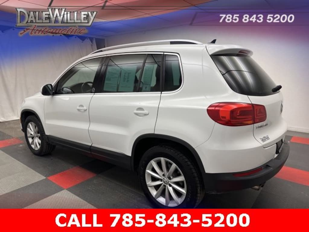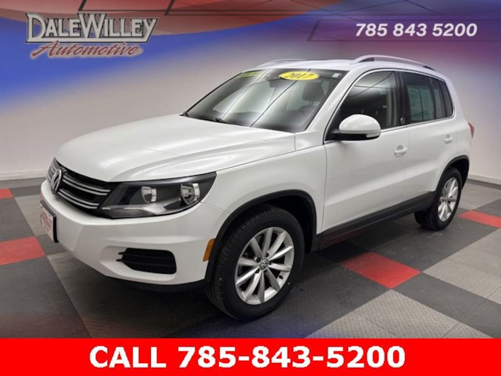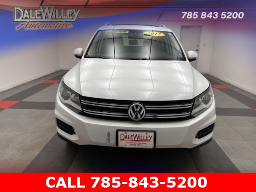 Located at Dale Willey Automotive Used Car and Truck Center / 2800 Iowa St, Lawrence, KS 66046. 2017 Volkswagen Tiguan Pure White 2.0T Wolfsburg Edition FWD 6-Speed Automatic with Tiptronic 2.0L TSI DOHC RECENT TRADE IN, MOONROOF SUNROOF, HEATED SEATS, Tiguan 2.0T Wolfsburg Edition, 4D Sport Utility, 2.0L TSI DOHC, 6-Speed Automatic with Tiptronic, FWD, Pure White, Charcoal Black Leatherette, Alloy wheels, Dual front impact airbags, Dual front side impact airbags, Electronic Stability Control, Exterior Parking Camera Rear, Fully automatic headlights, Heated Front Bucket Seats, Heated front seats, Occupant sensing airbag, Overhead airbag, Power driver seat, Power moonroof, Power passenger seat, Radio data system, Radio: AM/FM/HD/CD w/USB & Aux-In, Remote Keyless Entry, Steering wheel mounted audio controls, Turn signal indicator mirrors, V-Tex Leatherette Seating Surfaces.